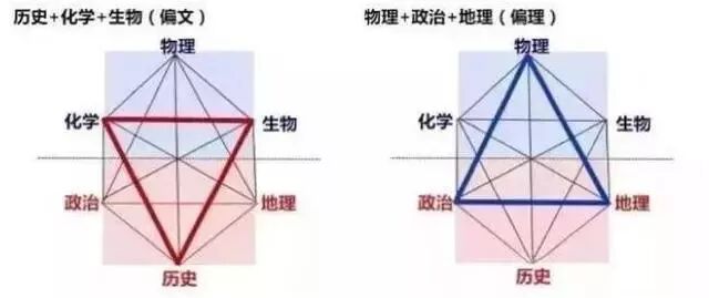 我们将传统的三门理科标记为蓝色,传统的文科标记为红色。每一个选课结果都能形成一个三角形,通过三角形里红蓝颜色的对比,能看出你的选科组合是偏文还是偏理,比如: