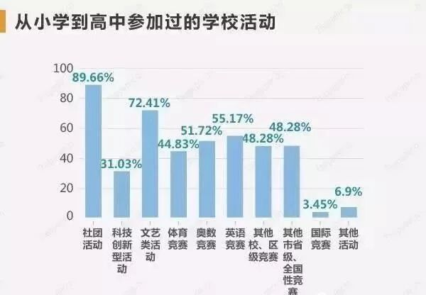 从小学到高中,状元们参加过的学校活动排名前四依次为社团活动、文艺类活动、英语竞赛、奥数竞赛。校外活动中,状元们较热衷的是社区服务(55.17%)、公益志愿者(51.72%)。
